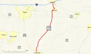 SH 322 begins at a junction with US 259 in Henderson. It heads northeast from this junction to an intersection with FM 850. The highway continues to the northeast to an intersection with FM 1249. Heading towards the north, the highway continues to a junction with FM 2011. The highway continues to the north to an intersection with FM 2204. It continues to the north to a junction with FM 349 in Lakeport. As the highway continues to the northeast, it intersects SH 149 in Lakeport. SH 320 and SH 149 begin to run concurrently to the north until they split in Longview. SH 322 reaches its northern terminus at I-20 in Longview. The roadway continues to the north as Loop 281.[2]