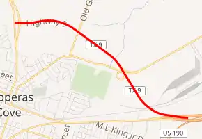 The entire current route of SH 9 is a two-lane expressway sandwiched between the city of Copperas Cove and Fort Hood. It is three miles (4.8 km) and is entirely in Coryell County. SH 9 begins at an intersection with FM 116 (which is briefly a four-lane highway with a wide median) north of downtown Copperas Cove. It travels east entering the border of Fort Hood first crossing over Old Georgetown Road, then under Tank Destroyer Boulevard. Tank Destroyer Boulevard has a partial interchange with SH 9 allowing eastbound traffic to exit towards the base while traffic exiting the base may enter to the westbound lane. After passing over a railroad, SH 9 ends at a partial interchange with Bus. US 190 east of the city. The only movements allowed at the interchange are eastbound SH 9 to eastbound Bus. US 190 and vice versa. This interchange is within the same complex where Bus. US 190 has its eastern terminus at an interchange with Interstate 14 and US 190.[3]