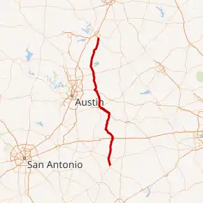 The route was designated on April 21, 1924 along a route from Taylor to Elgin.[13] On April 6, 1932, it extended south to Hochheim, replacing SH 109.[14] On July 15, 1935, the section from Elgin to Flatonia was cancelled, creating a gap.[15] On February 21, 1937, the section from Elgin to Bastrop was restored, partially closing the gap.[16] On February 9, 1939, the road had already been improved from Elgin to Sayersville and this completed the connection to Bastrop. The Works Progress Administration funded the $109,000 relief project.[17] On September 26, 1939, the section from Yoakum to Hochheim was transferred to SH 111, and the section from Flatonia to Yoakum was renumbered to SH 297, eliminating the gap. On November 20, 1939, before signage was changed, SH 297 was changed back to SH 95, creating a gap between Flatonia and Bastrop. On May 29, 1941, the section of SH 95 from Flatonia north to Smithville was restored as a temporary route and SH 95 was concurrent with SH 71 between Bastrop and Smithville, closing the gap. The temporary route later became the permanent route because TxDOT could not construct a more direct route for SH 95 from Bastrop to Flatonia. On November 24, 1978, the section from SH 53 to SH 36 in Temple was cancelled and transferred to Loop 363.