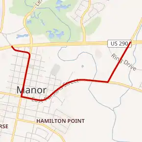 Loop 212 starts northwest of Manor at US 290. It proceeds along Murray Avenue and then turns south to follow Lexington Street through the center of Manor. It turns east at Parsons Street at an intersection with FM 973. Upon leaving Manor, Loop 212 is renamed to Old State Highway 20. Loop 212 then turns north to intersect again with US 290. Loop 212 terminates here, while the road continues to the north of US 290 as FM 973.[3]
