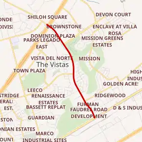 Spur 588 begins at an intersection with I-20 Business in Odessa, Midland County, heading northwest on four-lane undivided Faudree Road. The road passes between the Odessa Country Club to the west and commercial areas to the east before running between the golf course and residential neighborhoods. The highway continues past more housing subdivisions with some fields, crossing into Ector County. Spur 588 reaches its northern terminus at an interchange with SH 191.[1][2][3]