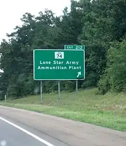 Spur 74 provides access from I-30 to the now-deactivated Lone Star Army Ammunition Plant. The southern terminus is at US 82 near Victory City, at the entrance to the Lone Star Army Ammunition Plant.[2] The short route travels north through Leary before ending at an interchange with I-30 at Exit #212.[1]