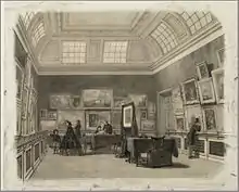 Teylers Foundation started collecting contemporary Dutch paintings in 1821. The paintings were either commissioned directly from the painters or acquired at exhibitions. The first room used to display paintings was the room that is today used as a print cabinet and was added to the Oval room in 1824 along with the library room upstairs.[1] The lack of light quickly made viewing the paintings there unpopular and it was used mostly for lectures and experiments. According to the archives, the expansion was done by the foundation's own building crew that was on hand for day-to-day improvements. The gallery had large curved windows like the Oval room, which have since been closed. An impression of the original windows can be seen in a charcoal sketch by Johan Conrad Greive in 1862. The collection today is mostly based on that same group of paintings. The gallery also contains a table that was used to hold the portfolios of drawings and a similar portfolio with Rembrandt and Michelangelo reproductions can still be consulted (the actual drawings are held in special storage).