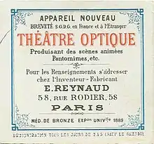 The Théâtre Optique (Optical Theatre) is an animated moving picture system invented by Émile Reynaud and patented in 1888. From 28 October 1892 to March 1900 Reynaud gave over 12,800 shows to a total of over 500,000 visitors at the Musée Grévin in Paris. His Pantomimes Lumineuses series of animated films include Pauvre Pierrot and Autour d'une cabine.[1][2] Reynaud's Théâtre Optique predated Auguste and Louis Lumière's first commercial, public screening of the cinematograph on 28 December 1895, which has long been seen as the birth of film.
