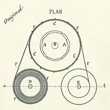 The realized films had 300 to 700 transparent pictures of successive phases of moving figures with black backgrounds. The pictures were hand painted by Reynaud in aniline inks directly on 6 x 6 cm gelatin plates.[1] The plates were coated with shellac and framed in a cardboard strip of which the sides were clad in fabric bands attached with split pins. The horizontal film strip could be up to 50 meters long, with black leader tape at the beginning. Central perforations in the cardboard between the images engaged with metal notches protruding from a large central turning wheel. The wheel transferred the strip between two copper 25 cm spools. The film was guided further by pinch rollers at the corners of the table and passed in front of a magic lantern. The magic lantern projected each image in turn towards one of the 36 rectangular mirrors at the center of the turning wheel. Each image was in turn reflected to another mirror, which reflected it through a focusing lens towards a movable mirror. The movable mirror could be adjusted to project the moving characters at the desired place within an immobile background image on the screen. The background was projected with a second magic lantern from a painted glass plate. Reynaud would manipulate the speed of the film by hand and repeat movements to produce a visual story that could last longer than 10 minutes.[1] The projectionist operated the machine behind the screen, with only the projection visible to the audience.[3][4][5]