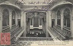 According to the present theatre's Web site, at some point in the nineteenth century, the Duke of Gramont built a rudimentary little theatre on this property, where he had also installed his mistress, opera singer Mademoiselle Coupé. Reputedly, the theatre privately offered a repertory that included risqué, even salacious work. In 1892, the space was renovated as a public concert hall with entrance in the adjoining courtyard area of Cité Monthiers. The hall, which featured orchestra level and three-sided balcony seating, as well as a large upstage organ, was named Salle Berlioz in honor of French composer, conductor, and music critic Hector Berlioz (1803-1869), who had lived nearby on the rue de Calais.[1]