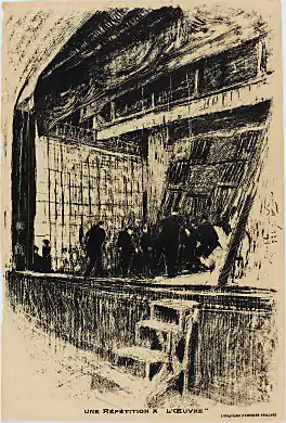 With the help of poet and critic Camille Mauclair and the painter Édouard Vuillard (with whom Lugné-Poe was sharing an apartment), the director dedicated the theatre to presenting the work of the young French Symbolist playwrights in addition to introducing new foreign dramas. The group established themselves that same year, renting a small rehearsal room atop Salle Berlioz and calling themselves Maison de l'Œuvre, or literally, the "House of Works."[6] Lugné-Poe, however, soon established company offices at 23, rue Turgot, eventually moving operations across the street to no. 22. None of the productions in the seminal phase of his art theatre (1893-1899) appeared at the Salle Berlioz.[7]