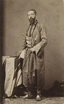In November 1864 Devéria met the future oriental scholar Arthur Rhoné (1836–1910). A month later Devéria, Rhoné and some friends sailed to Egypt, where they visited Alexandria, Cairo, Memphis, and saw the work on the Suez Canal by Ferdinand de Lesseps.[2] Devéria made drawings and took photographs that were reproduced in an album of 77 plates.[1] The party went on to the Holy Land, Damascus and Istanbul.[3] Devéria made a fourth and last visit to Egypt in 1865-66, traveling with Mariette. In 1868 he was made a knight of the Legion of Honor. He died in Paris on 31 January 1871.