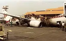 Thai Airways International Flight 114, a Thai Airways International Boeing 737-400 bound for Chiang Mai from Don Mueang Airport in Bangkok, was destroyed by an explosion of the center wing tank resulting from ignition of the flammable fuel/air mixture in the tank while the aircraft was parked prior to boarding on the ground on 3 March 2001. The source of the ignition energy for the explosion could not be determined with certainty, but the most likely source was an explosion originating at the center wing tank pump as a result of running the pump in the presence of metal shavings and a fuel/air mixture. One flight attendant died.[1]