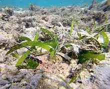 Thalassia hemprichii, called Pacific turtlegrass, is a widespread species of seagrass in the genus Thalassia, native to the shores of the Indian Ocean, the Red Sea, and the western Pacific Ocean.[2] Its growth rate increases with CO2 enrichment, and it can tolerate lowered light conditions caused by algal blooms, allowing for it to respond positively to ocean acidification and other disturbances.[3]