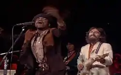 Although he left Apple midway through 1971, as a result of business issues related to the Beatles' break-up,[59] Preston continued to work with Harrison throughout the 1970s.[60] In response to a request from the former Beatle, Preston agreed to play at the Concert for Bangladesh on 1 August 1971, to raise funds and awareness for refugees of the Bangladesh Liberation War.[61][62] Preston joined a large band that included Harrison, Clapton, Ringo Starr, Leon Russell and backing singers such as Claudia Lennear and Joe Greene,[63] the last of whom co-wrote some of the songs on Preston's first A&M album, I Wrote a Simple Song.[64] Two shows were held that day, at Madison Square Garden in New York,[65] at each of which Preston performed a rousing version of "That's the Way God Planned It".[66] The performance from the evening show, which appeared on the live album of the event and in the 1972 concert film,[67] ended with Preston leaving his seat behind the Hammond organ and dancing across the front of the stage,[68] delighting the New York audience.[66] Preston later recalled of this spontaneous act: "I got happy … The band was jamming and it was pumping, the people were with us – and, you know, I just had to rejoice!"[69]