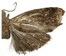 The length of the forewings is about 6 mm. The forewings are dark brown, irregularly and faintly mixed with specks of charcoal, rust and cream. There is an inconspicuous pair of tiny cream dots ringed with orange near the distal end of the discal cell, as well as a narrow cream irregular band extending along the termen. The hindwings are nearly uniform brown.