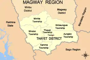 Thayet District (Burmese: သရက်ခရိုင်; also Thayetmyo District) is a district of the Magway Division in central Burma (Myanmar).[1] The administrative centre is the town of Thayet.