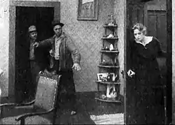 The tramps find their way into the house, planning to loot it. Their plans are foiled by Heath's returning home, so they hide in a closet. He is drunk and when Emily tries to take the bottle away from him, he erupts into a rage. Hearing the noise, the tramps wonder what is happening, so they carefully open the closet door a bit to see. Heath is choking Emily and the tramps are horrified at the sight. One of them bolts out of the closet and wrestles with Heath to free Emily from his grasp. As the two men struggle, Heath's gun discharges and he is fatally shot.[8]