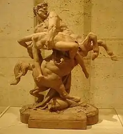 It is frequently supposed that Rodin, who was associated with Carrier-Belleuse's studio in the 1870s, contributed to the modeling; the general opinion is that, while the subject matter and the lines of Hippodamia exemplify Carrier-Belleuse's style, the expression and musculature of the centaur suggest Rodin.[1][3][lower-alpha 1]