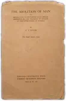 The Abolition of Man is a 1943 book by C. S. Lewis. Subtitled "Reflections on education with special reference to the teaching of English in the upper forms of schools," it uses that as a starting point for a defense of objective value and natural law as well as a warning about the consequences of doing away with them. It defends "man's power over nature" as something worth pursuing but criticizes the use of it to debunk values, the value of science itself being among them. The book was first delivered as a series of three evening lectures at King's College, Newcastle, part of the University of Durham, as the Riddell Memorial Lectures on February 24 to 26, 1943.