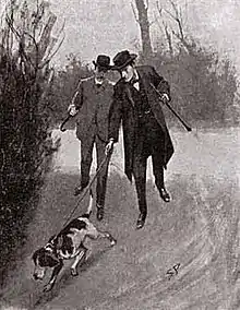 Holmes and Watson use a scenthound to find the missing man, 1904 illustration by Sidney Paget in The Strand Magazine