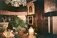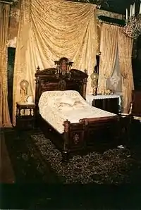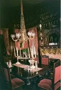 The Age of Innocence was filmed on location primarily in Troy, New York.[6] The opera scenes were filmed at the Philadelphia Academy of Music in Philadelphia, Pennsylvania. The scenes set in the home of Mrs. Mingott were filmed in "The Castle", a fraternity house belonging to the Alpha Tau chapter of Pi Kappa Phi at Rensselaer Polytechnic Institute. Formerly known as the Paine Mansion, after its completion in 1896 (then-estimated to cost $500,000), it was heralded as the grandest house in all of Troy.[7][8] The scenes depicting the country house in snow were filmed inside the circa 1737 Dutch-colonial Luykas Van Alen House, in Kinderhook, New York.[6] Only one major set was built, for an ornate ballroom sequence at the Beaufort residence.[9] The triangular Victorian Gothic Rice Building was used as the setting for the law office.[10]