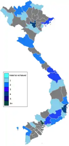 ![]() Provinces and municipalities visited by The Amazing Race Vietnam. ![]() Countries visited by The Amazing Race Vietnam as of Season 6.