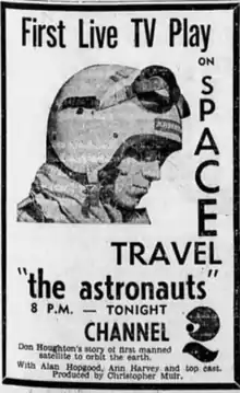 The Astronauts is a television film, or rather a live television play, which aired in Australia during 1960 on ABC. Broadcast originally in Melbourne on 18 May 1960, a kinescope recording was made of the broadcast and shown in Sydney on 27 July 1960 (it is not known if it was also shown on ABC's stations in Brisbane, Adelaide and Perth).[3]'Filmink magazine said it may be the only Australian drama about the space race.[4]