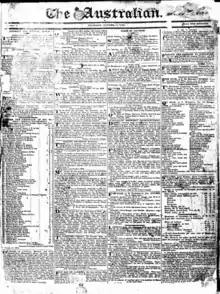 The first issue of The Australian appeared on Thursday, 14 October 1824. The owners of the newspaper were two lawyers, Robert Wardell and William Charles Wentworth.[2] They had a printing press and other necessary materials with them on the Alfred which arrived at Sydney from Britain in July 1824.[3]