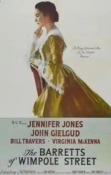 The Barretts of Wimpole Street is a 1957 British CinemaScope drama historical film originating from the United Kingdom, and was a re-make of the earlier 1934 version by the same director, Sidney Franklin.[4] Both films are based on the 1930 play The Barretts of Wimpole Street by Rudolf Besier. The screenplay for the 1957 film is credited to John Dighton, although Franklin used exactly the same script for the second movie as he did for the first.[5] The film, set in the early 19th century, stars Jennifer Jones, John Gielgud, and Bill Travers.