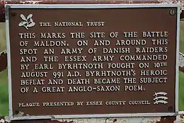 Other arguments against an early date focus on vocabulary and spelling, which, it is argued, suggest that the poem had its origins in the 11th century in western England, rather than from the 10th century in eastern England (where Maldon is located).[9][10] These arguments are not based upon one or two spellings which may have been transcribed poorly, but rather upon the uniform spelling of specific indicative words in Old English which are often associated with dialectical writing, such as “sunu” and “swurd”.[10] Clark further argues against an early composition date by exposing the contradictory descriptions of Byrhtnoth, both within the poem and against historical record. According to Clark, the poet of Maldon describes Byrhtnoth as an old warrior, but able-bodied (paraphrased); however, later in the poem Byrhtnoth is disarmed easily by a Viking. Clark argues that these two events are conflicting and therefore demonstrate the lack of historical accuracy within the poem.[9] Clark also argues that the poet never mentions the great height of Byrhtnoth, nor does he mention Byrhtnoth “enfeebled by age”,[9] which indicates that the poet was removed from the event, for the historical records show that Byrhtnoth was tall, which the poet would not have left out due to its indicative nature.[9]