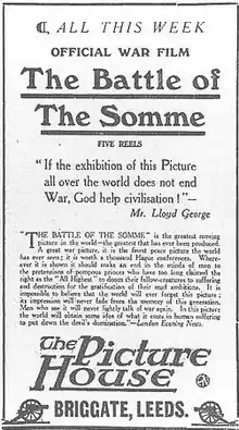 Some members of the audience considered it immoral to portray scenes of violence; Hensley Henson, the Dean of Durham, protested "against an entertainment which wounds the heart and violates the very sanctity of bereavement". Others complained that such a serious film shared the cinema programme with comedy films.[24] On 28 August, the Yorkshire Evening Post printed the comment, attributed to Lloyd George, "If the exhibition of this Picture all over the world does not end War, God help civilisation".[25] The film was shown to British troops in France from 5 September; Lieutenant-Colonel Rowland Feilding, an officer who saw the film in a muddy field near Morlancourt, described it as "a wonderful and most realistic production" but criticised the film for failing to record the sound of rifles and machine-guns, although there was an artillery accompaniment from guns firing nearby.[5] Feilding suggested that the film could reassure new recruits, by giving them some idea of what to expect in battle; the intertitles were forthright, describing images of injury and death.[26]