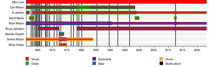![]() The Beach Boys during their 2012 reunion. From left: Brian Wilson, David Marks, Mike Love, Bruce Johnston, Al Jardine. | |
