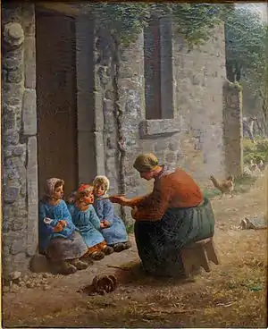 A mother, squatting on a stool in front of her farmhouse door, gives soup to her three children seated on the threshold, while the father, in the background, digs his garden. In a letter addressed to the art critic Théophile Thoré-Burger, who saw the canvas exhibited in the Martinet Gallery, Millet explained that his painting could be like "we imagine a brood of birds to which their mother feeds. The man works to feed these beings there”.[2]