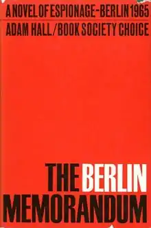 The Berlin Memorandum (UK title, published by Collins; published as The Quiller Memorandum in the US by Simon & Schuster),[1] is a 1965 spy novel written by Elleston Trevor (under the pseudonym Adam Hall). It is the debut novel of the character Quiller, who was ultimately featured in a series of 19 thrillers, until Trevor's death in 1995, having been Trevor's most popular character.[2]