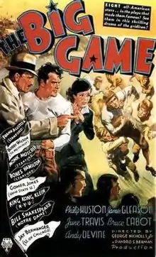 The Big Game is a 1936 American sports drama film directed by George Nicholls, Jr. and produced by RKO Radio Pictures, which released the film on October 9, 1936. The screenplay was written by Irwin Shaw, adapted from the 1936 novel of the same name by Francis Wallace. The film stars Philip Huston, James Gleason, June Travis, Bruce Cabot and Andy Devine. Huston (1908-1980) was a respected New York stage actor, who also had prominent roles in a number of motion pictures and, later, acted in television productions, as well.