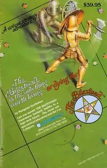 In The Bilestoad, players control "meatlings" that hack and battle with axes and shields from a top-view perspective. The name is derived from the German words Beil (axe) and Tod (death). The odd spelling reflects Goodman's idea of a future language similar to A Clockwork Orange's Nadsat in which English has been modified by the borrowing of foreign words.[1] Although the game may seem medieval, the backstory in the manual explains that the axe fighting is actually a future virtual reality game designed to reduce real violence.