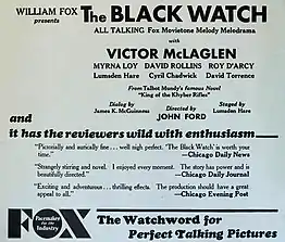 The Black Watch is a 1929 American Pre-Code adventure epic film directed by John Ford and starring Victor McLaglen, Myrna Loy, and David Torrence. Written by James Kevin McGuinness based on the 1916 novel King of the Khyber Rifles by Talbot Mundy, the film is about a captain in the British Army's Black Watch regiment assigned to a secret mission in India just as his company is called to France at the outbreak of war. His covert assignment results in his being considered a coward by his fellows, a suspicion confirmed when he becomes involved in a drunken brawl in India that results in the death of another officer. The film features an uncredited 21-year-old John Wayne working as an extra; he also worked in the arts and costume department for the film.[1] This was director John Ford's first sound film.
