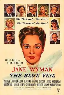 The Blue Veil is a 1951 American historical drama film directed by Curtis Bernhardt and starring Jane Wyman, Charles Laughton and Joan Blondell. It tells the story of a woman who spends her life caring for other people’s children, beginning just after World War I. The title refers to the headdresses once worn by governesses and nannies, colored blue to distinguish them from the white veils worn by medical nurses. The screenplay by Norman Corwin is based on a story by François Campaux, adapted for the French-language film Le Voile Bleu in 1942.[3]