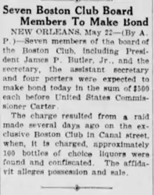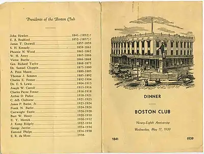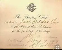 Founded in 1841, The Boston Club is the third oldest Gentlemen's City Club in the United States behind The Philadelphia Club in Philadelphia and Union Club of the City of New York in New York City. Members organized and rented rooms first at the Merchants Exchange, 126 Royal St, in the Vieux Carre, then 129/130 Canal Street until the Civil War when it closed from 1862 to 1866. After the war, it occupied 214 Royal Street (currently the Hotel Monteleone) until 1867 at which point it moved to 4 Carondelet Street, the former home of New Orleans financier, Edward J. Forstall. In 1884 it moved into its current clubhouse at 824 Canal Street (then known as 148 Canal Street) and the house was fully purchased by 1905.[3] The club was closed for 3 years during the Civil War.[4]