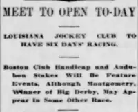 Members of the Boston Club frequently patronized Jockey Clubs of the area, both the defunct Metairie Course (now the Metairie Cemetery) and the Fair Grounds Race Course, putting up high stakes purses to help offset the Jockey Club's expenses. "The Boston Club...being composed of gentlemen who know ‘what's what’...insured a numerous and distinguished attendance upon these occasions."[50] Later noting "In the betting circles last evening... The wagering was spirited and lively, and a good deal of money will change hands as a result."[51] John Randolph Grymes owned filly Susan Yandal who raced in the first races at the Fair Grounds Race Course in 1838, his cousin Henry A. Tayloe, youngest son of turfman John Tayloe III, was one of the proprietors along with local, Bernard de Marigny.