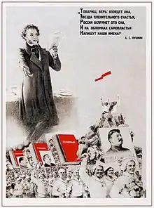 Pushkin's poem became particularly significant during the Soviet era. Pushkin depicted Peter as a strong leader, so allowing Soviet citizens to praise their own Peter, Joseph Stalin.[26] Stalin himself was said to be “most willingly compared” to Peter the Great.[27] A poll in Literaturnyi sovremennik in March 1936 reported praise for Pushkin's portrayal of Peter, with comments in favour of how The Bronze Horseman depicted the resolution of the conflict between the personal and the public in favour of the public. This was in keeping with the Stalinist emphasis of how the achievements of Soviet society as a whole were to be extolled over the sufferings of the individual.[26] Soviet thinkers also read deeper meanings into Pushkin's works. Andrei Platonov wrote two essays to commemorate the centenary of Pushkin's death, both published in Literaturnyi kritik. In Pushkin, Our Comrade, Platonov expanded upon his view of Pushkin as a prophet of the later rise of socialism.[28] Pushkin not only 'divined the secret of the people', wrote Platonov, he depicted it in The Bronze Horseman, where the collision between Peter the Great's ruthless quest to build an empire, as expressed in the construction of Saint Petersburg, and Evgenii's quest for personal happiness will eventually come together and be reconciled by the advent of socialism.[28] Josef Brodsky’s A Guide to a Renamed City "shows both Lenin and the Horseman to be equally heartless arbiters of other’s fates," connecting the work to another great Soviet leader.[29]