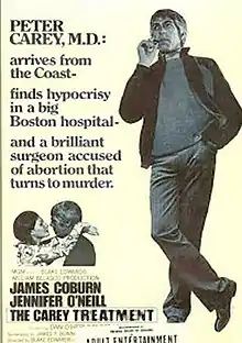 The Carey Treatment is a 1972 American crime thriller film by Blake Edwards based on the 1968 novel A Case of Need credited to Jeffery Hudson, a pseudonym for Michael Crichton. Like Darling Lili and Wild Rovers before this, The Carey Treatment was heavily edited without help from Edwards by the studio into a running time of one hour and 41 minutes; these edits were later satirized in his 1981 comedy S.O.B..[1][2]