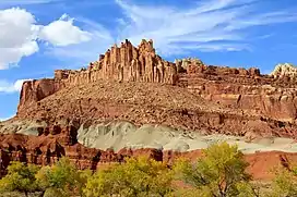 The Castle is a 6,387-foot (1,947 m) summit in Capitol Reef National Park in Wayne County, Utah, United States.[2] This iconic landmark is situated 0.5 mi (0.80 km) immediately north of the park's visitor center, towering nearly 800 feet (240 m) above the center and Utah State Route 24. Precipitation runoff from this feature is drained by tributaries of the Fremont River.