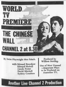 The Chinese Wall is a 1963 Australian television play.[2] It was the television world premiere of a farce by contemporary Swiss playwright Max Frisch.[3][4]