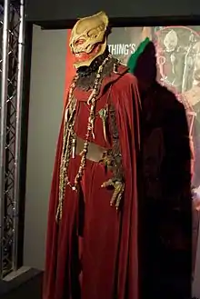 The episode's opening shot is a repeat of the opening shot of "Rose".[3] The cone-shaped building which has all its glass blown out from the ship's shockwave is 30 St Mary Axe, also known as the Swiss Re Building or "The Gherkin".[4] The climactic scenes of the episode were shot on location at Wallis House, Brentford, one of the Golden Mile's few remaining Art Deco buildings.[5] Parts of the episode were filmed at the Clearwell Caves in Gloucestershire.[6] The prototype of the Sycorax swords was auctioned on eBay to raise funds for the Great Ormond Street Hospital Children's Charity.[7] It raised £920.51.[8] During the live broadcast, the front page of the official BBC website stated: "THE CHRISTMAS INVASION is on BBC One NOW. HARRIET JONES SAYS: Switch this website off for Britain."[9] The tie-in website "Who is Doctor Who?" was also updated with a message from Mickey referencing the Guinevere One website, and an appeal to the Doctor to bring back Rose.[10]