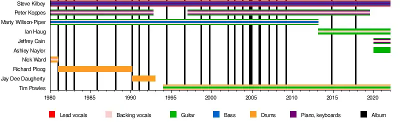 The founding members were Steve Kilbey on lead vocals and bass guitar, Peter Koppes and Marty Willson-Piper on guitars, and Nick Ward on drums. Ward played only on their debut album, and the band's drummer for the rest of the 1980s was Richard Ploog. Jay Dee Daugherty (ex-Patti Smith Group) played drums from 1990 to 1993, followed by "timEbandit" Tim Powles (ex-The Venetians), who remains with them to the present day. Koppes left the band from 1992 to 1997,[4] and Willson-Piper left in 2013. Ian Haug, formerly of Powderfinger, replaced him. Kilbey, Koppes, and Powles also recorded together as The Refo:mation in 1997.