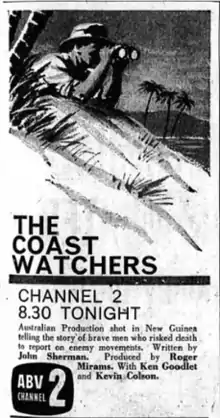 The Coastwatchers is a docudrama television film about coastwatchers made in 1959 by producer Roger Mirams for Pacific Films. It starred Ken Goodlet and Kevin Colson and was written by John Sherman and directed by Mirams.[5]