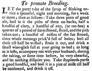 Recipes are provided for home-made medicines and remedies such as "To promote Breeding" for women wanting to become pregnant. The recipe calls for a spoonful of "stinking orrice"[lower-alpha 3] syrup to be taken night and morning, and for "good ale" to be boiled with "the piths of 3 ox-backs,[lower-alpha 4] half a handful of clary, a handful of nep (or cat-bos)",[lower-alpha 5] dates, raisins, and nutmegs. The woman drinking this mixture "at your going to-bed" is enjoined "as long as it lasts, accompany not with your husband."[14]