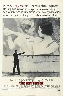 The Conformist (Italian: Il conformista) is a 1970 political drama film directed by Bernardo Bertolucci, whose screenplay is based on the 1951 novel The Conformist by Alberto Moravia. The film stars Jean-Louis Trintignant, Stefania Sandrelli, Gastone Moschin, Enzo Tarascio, Fosco Giachetti, José Quaglio, Dominique Sanda and Pierre Clémenti. The film was a co-production of Italian, French, and West German film companies.