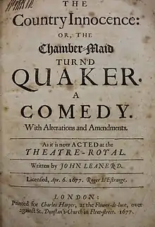 The Country Innocence; Or, The Chamber-maid Turn'd Quaker is a 1677 comedy play by the English writer John Leanerd. It was originally performed by the King's Company at the Theatre Royal, Drury Lane in London. It borrowed very heavily from the 1647 work The Countrie Girl by Thomas Brewer.[1]