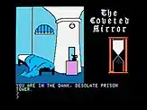 The Coveted Mirror utilizes a text parser, in which the player types commands to perform actions in the game.[3] Additionally, part of the challenge of The Coveted Mirror involves frequent, timed escapes from the jail tower. Within a limited timeframe, indicated by an hourglass, the player must search the castle, find objects, and talk to people and return to the cell by the time the jailer makes his rounds. This timed element adds another dimension to the exploration and puzzle solving.[4] The original version also included several little arcade style scenes that work into the solution of the adventure, such as a jousting game and a fishing game. The later Comprehend version[5] released in 1986 replaced the two-word parser with a full-sentence parser and was released for more computer systems than the original Apple II version, but omitted the arcade-style scenes and replaced them with other puzzles.[6]