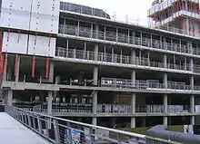 BuildAbility then subcontracted work for the construction of the concrete shell to O'Donnell, who assembled two tower cranes at either end of the site. O'Donnell used a formwork construction technique in partnership with PERI Ltd. to construct the cores, columns and basement walls. A rail climbing system was installed, which provided a scaffolding cage around the workforce during building. Lifting platforms were used to reduce the space occupied by scaffolding. An aluminium fast slab formwork system named Skydeck was used to construct the floorplates.[8] BuildAbility decided to use unbonded post-tensioned concrete, an uncommon system in the UK, for the floorplates as this allowed them to be thinner and reduced construction time.[7]
