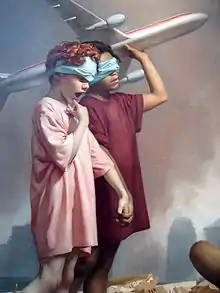The painting has been noted for its academic style, inspired both by Jacques-Louis David and William Bouguereau, and for its highly symbolic content, said to express the cycle of denial and tragedy. It has been compared and contrasted with Pablo Picasso's Guernica and Théodore Géricault's The Raft of the Medusa, both comments on catastrophes. A review in The New York Times summarized that "Mr. Parrish has a fine arsenal of talent and ideas, but this particular work comes off as overly staged, showy and annoyingly melodramatic, the clichéd pomp and classical symbolism drowning out a gentler, more compassionate spirit."[3] James Panero, writing in The New Criterion, believed "The cycle of terror and tragedy: September 11, 2001," is a pretty good painting that manages to be monumentally terrible."[4] In response, Aimee Pozorski wrote that "In fact, it is true that what Parrish has created is a lovely and symmetrical allegory: The twin bodies--strong, virile, and painted as if part of a Botticelli painting--are also allegories for the virile twin towers about to fall. The children holding planes represent the loss of innocence of an entire nation."[5]
